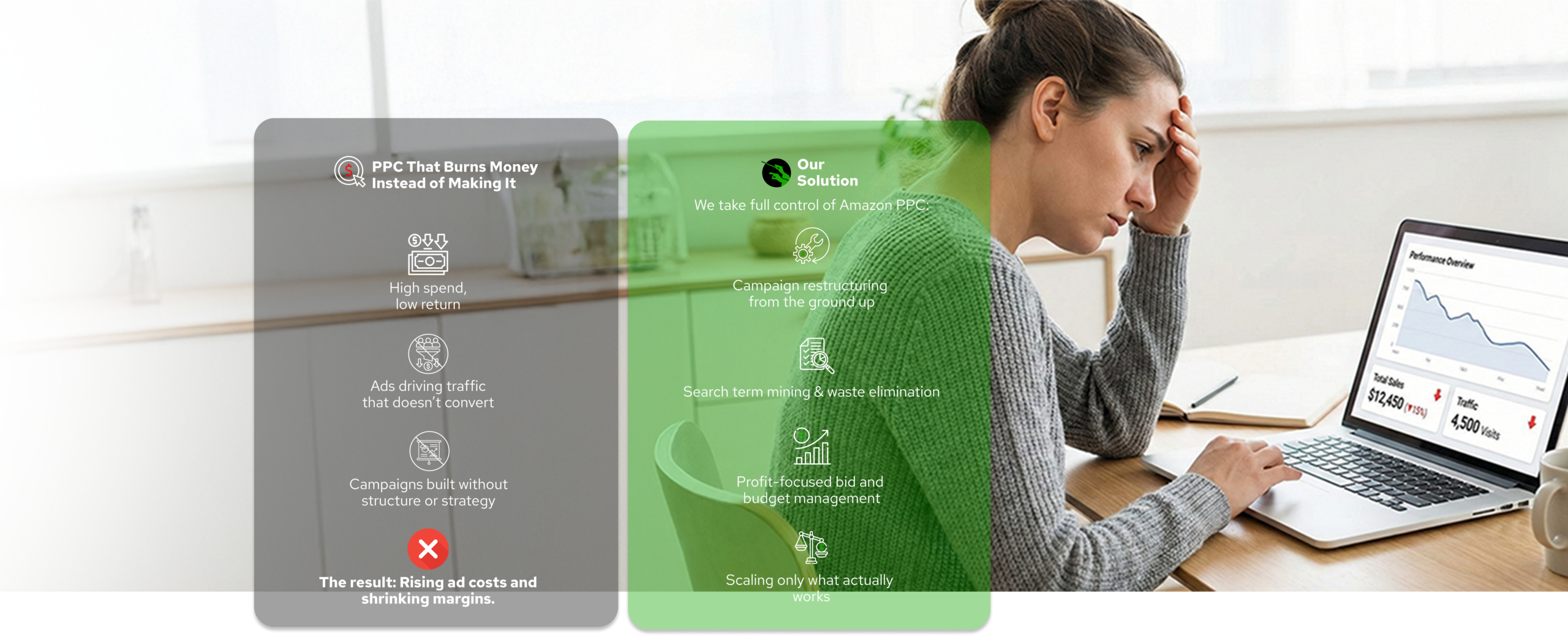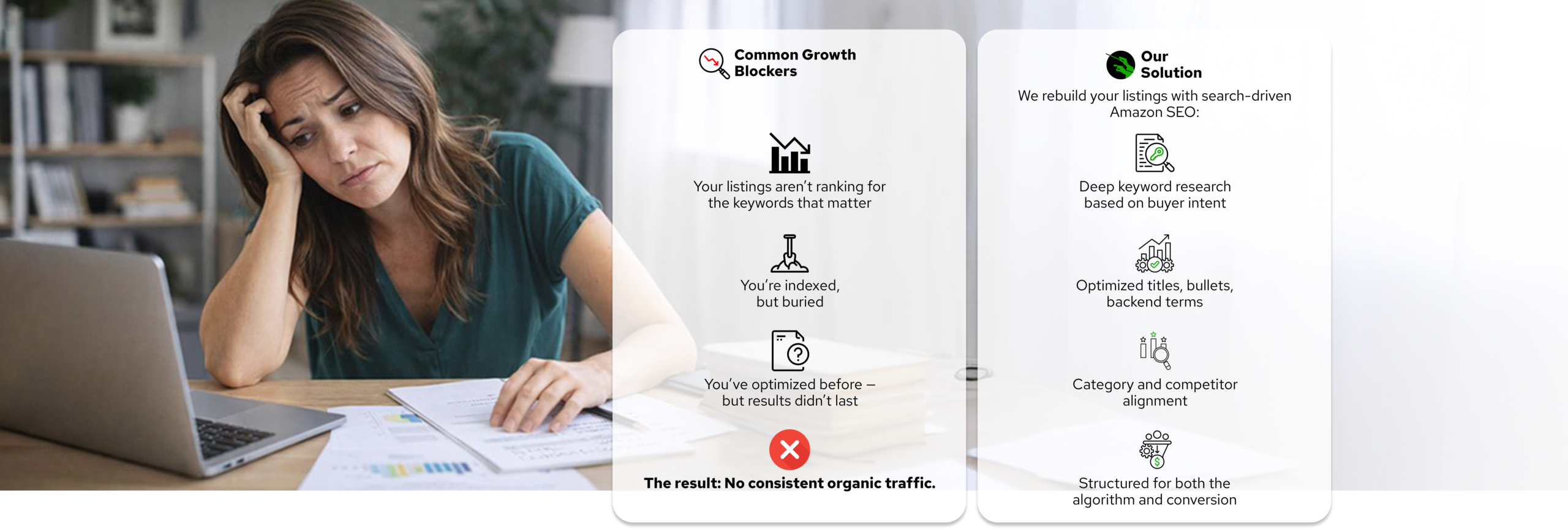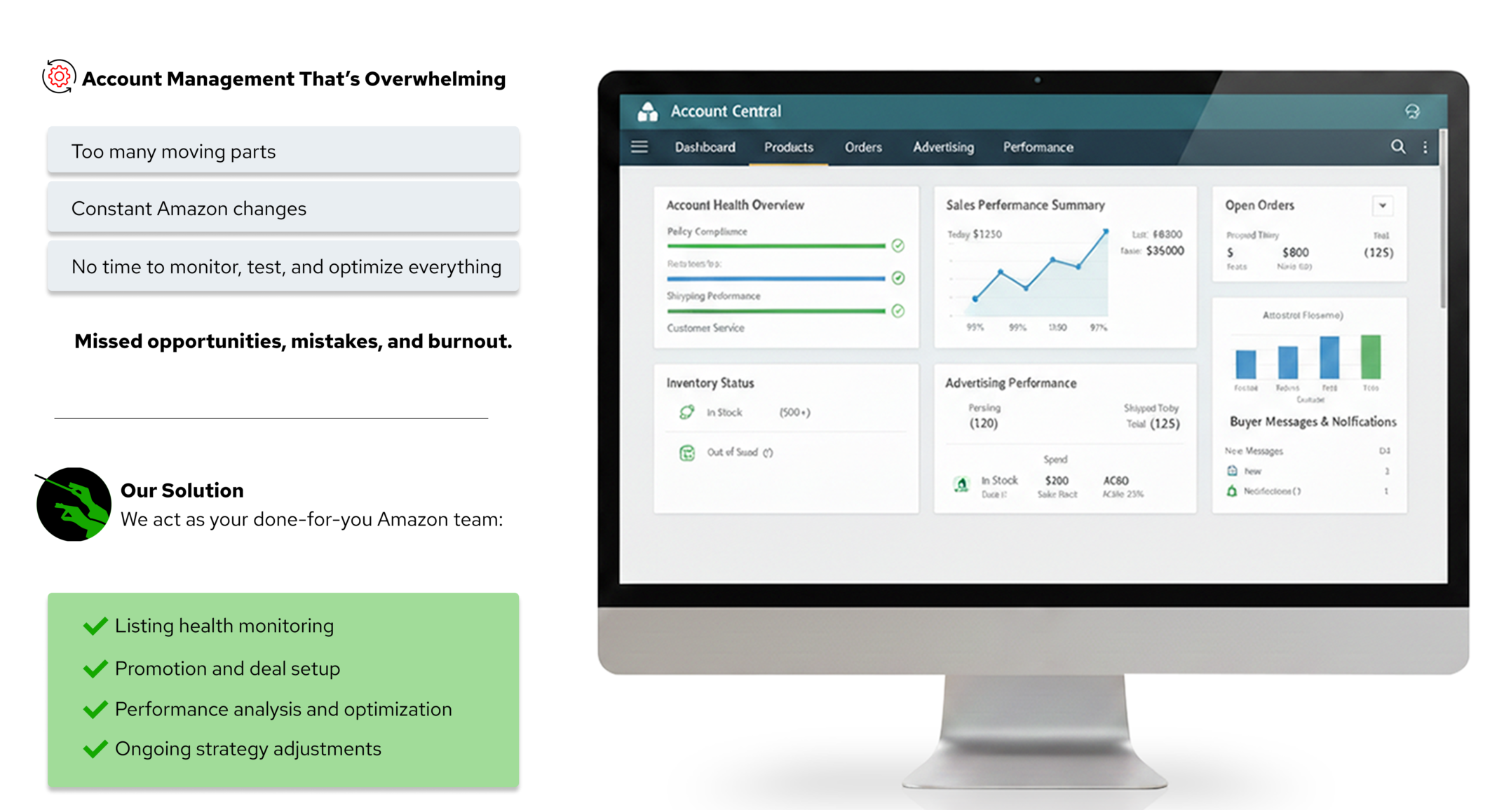Most Amazon sellers don’t fail because their product is bad. They stall because Amazon has become too complex to manage alone. If you’re doing this yourself, you’re likely dealing with:
